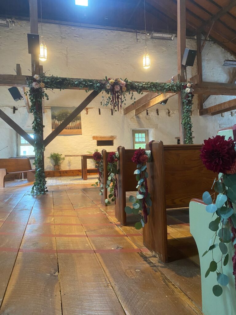 The Barn contains a restored 1700s dairy barn that serves as a sanctuary space for ceremonies.